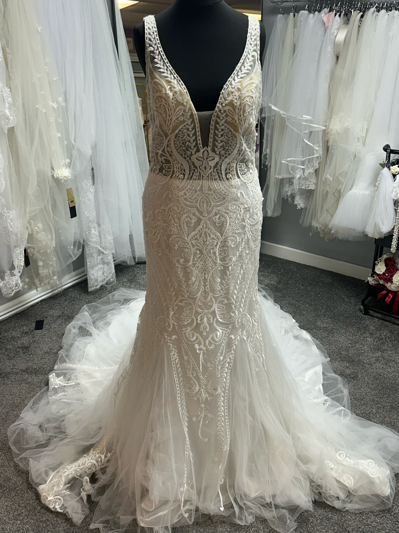 What truly sets this gown apart is the dramatic fit-and-flare skirt that hugs close through the hips before exploding into layers of soft, romantic tulle at the knees. The voluminous mermaid-style train features gorgeous ruffled tulle layers edged with delicate lace appliqués, creating incredible movement and that show-stopping wow-factor as you walk down the aisle.