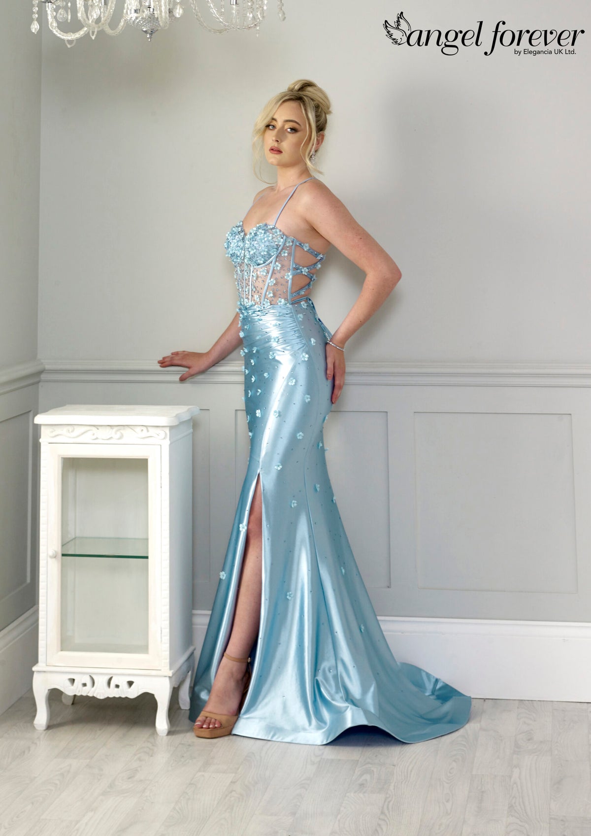 The Angel Forever Ice Blue gown is a breath-taking showcase of modern elegance and whimsical charm. This shimmering satin dress features a structured bodice adorned with delicate 3D floral appliqué and sparkling beadwork, creating a magical, light-catching effect from every angle. The sweetheart neckline and slim spaghetti straps offer a flattering, feminine silhouette, while the sheer corset-style bodice adds a contemporary twist.