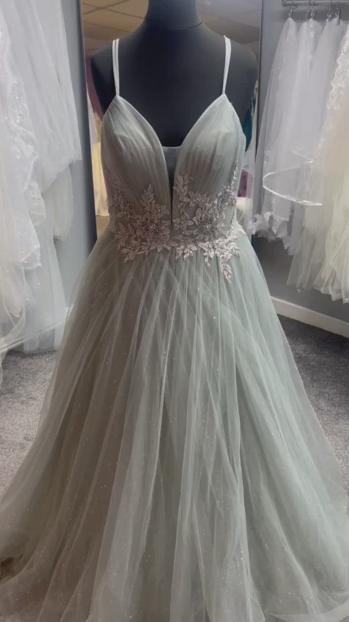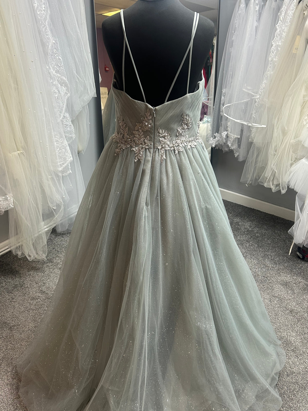 This silver gown offers a refined and graceful look, perfect for formal occasions. The bodice is detailed with shimmering embroidery and subtle sequin accents, creating a soft sparkle that catches the light beautifully. Spaghetti straps and a gently plunging neckline provide a modern touch, while the full tulle skirt falls elegantly to the floor. This dress is ideal for proms, evening events, or bridesmaids who want a sophisticated and timeless style.