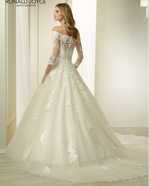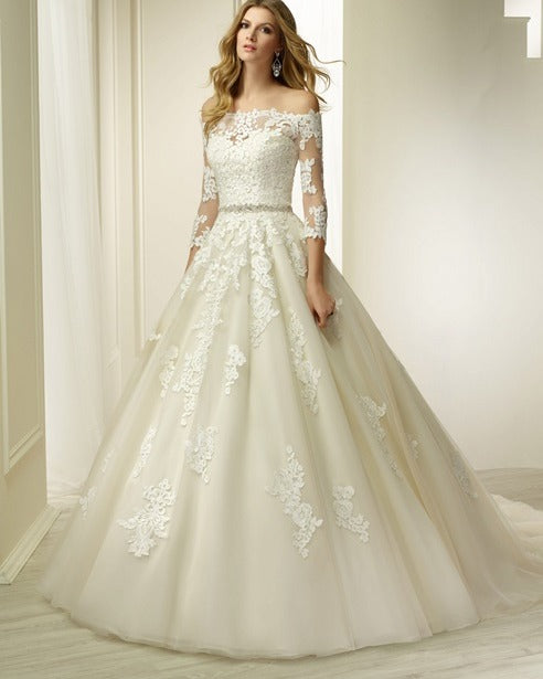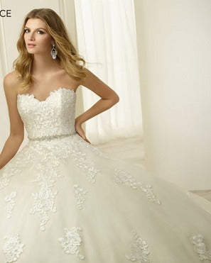 This strapless ballgown is a fairytale-like creation, with layers of organza and satin fabric combining to create a dramatic and voluminous effect. The intricate lace appliques add a touch of whimsy and romance, while the detachable beaded belt allows for a customizable fit. The long-sleeved, off-the-shoulder lace jacket provides a dramatic and regal touch, making this dress perfect for a princess-like bride.