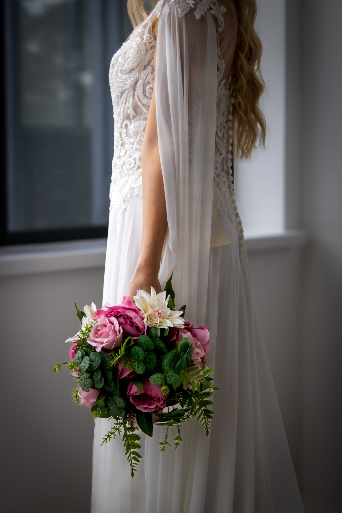 This dramatic yet elegant chiffon wedding dress is a stunning embodiment of bridal sophistication, designed to make a striking statement on your special day. Adorned with exquisite lace accents, the gown features a graceful bateau neckline that adds an air of refinement, while the illusion back detail offers a captivating glimpse of skin, enhancing its romantic appeal. The detachable full-length cape sleeves elegantly cascade from the shoulders, providing an ethereal touch that billows beautifully with every movement, creating a memorable silhouette. This enchanting gown is perfect for the modern bride who seeks a harmonious blend of drama and elegance, ensuring she radiates grace as she walks down the aisle.