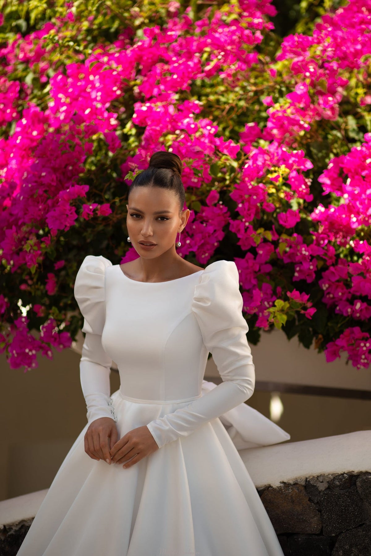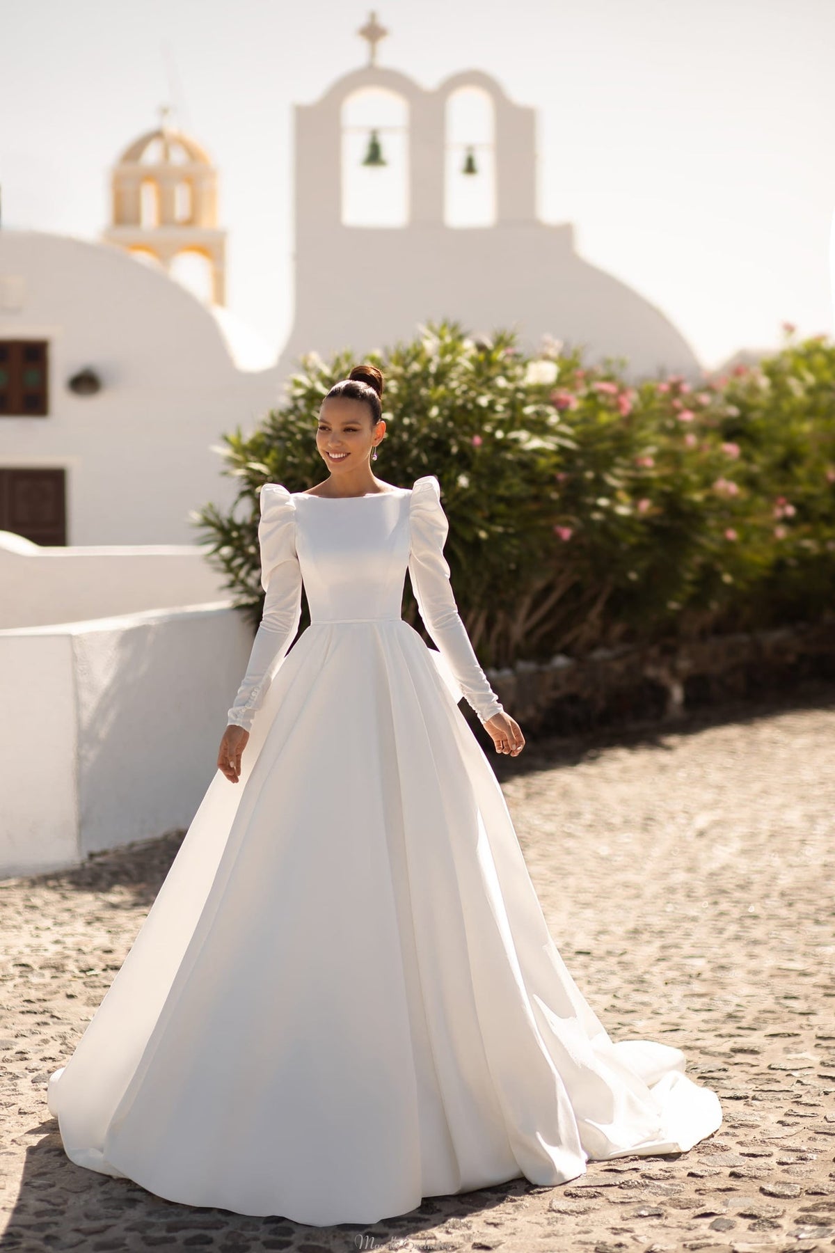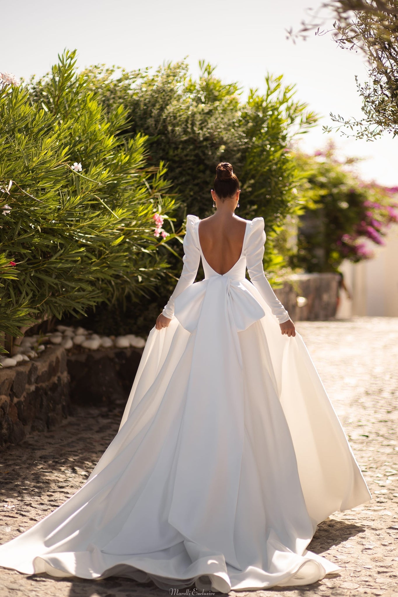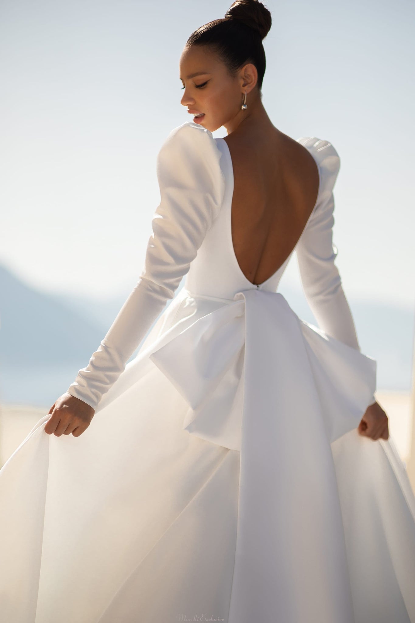A luxurious wedding dress with a “princess” silhouette, which will allow you to immerse yourself in a real fairy-tale atmosphere. With long airy sleeves in shiny fabric, which are decorated with buttons. A lush skirt with hidden pockets creates dramatic volume. An open back with a deep V-neckline and a luxurious bow complete the fabulous look.