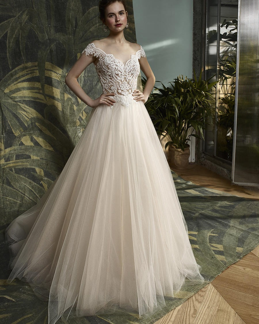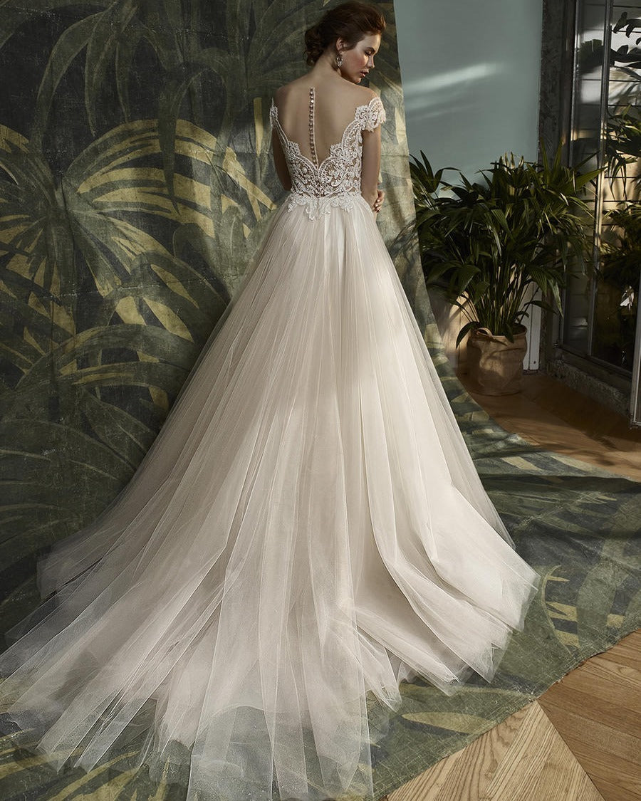 The combination of tulle and lace creates a light-as-air, ethereal quality, while the illusion and lace bodice and back add a touch of whimsy and romance. The buttons running down the back of the gown create a dramatic and regal touch, making this dress perfect for a fairytale-like wedding. The overall effect is one of understated elegance and sophistication, making this dress a stunning choice for any bride looking to make a memorable impression.