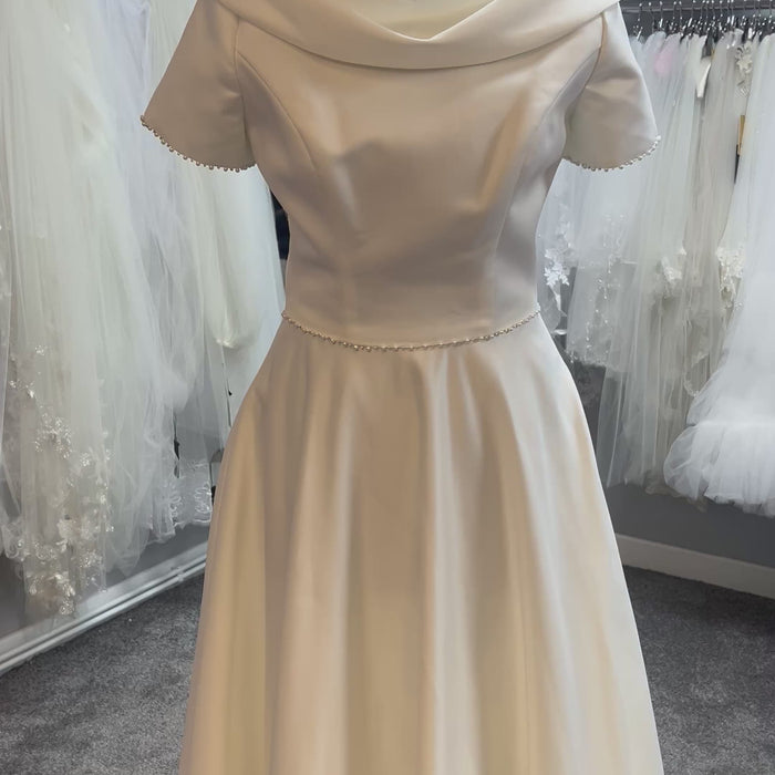An authentic tea-length gown with stunning A-line skirt and alternative shawl, cowl like collar. Delicate pearl and crystal beading has been sewn onto the cap sleeve hem edges and around the waist of this dress to make it sparkle when it catches the light. Fastened with a zip at the back.