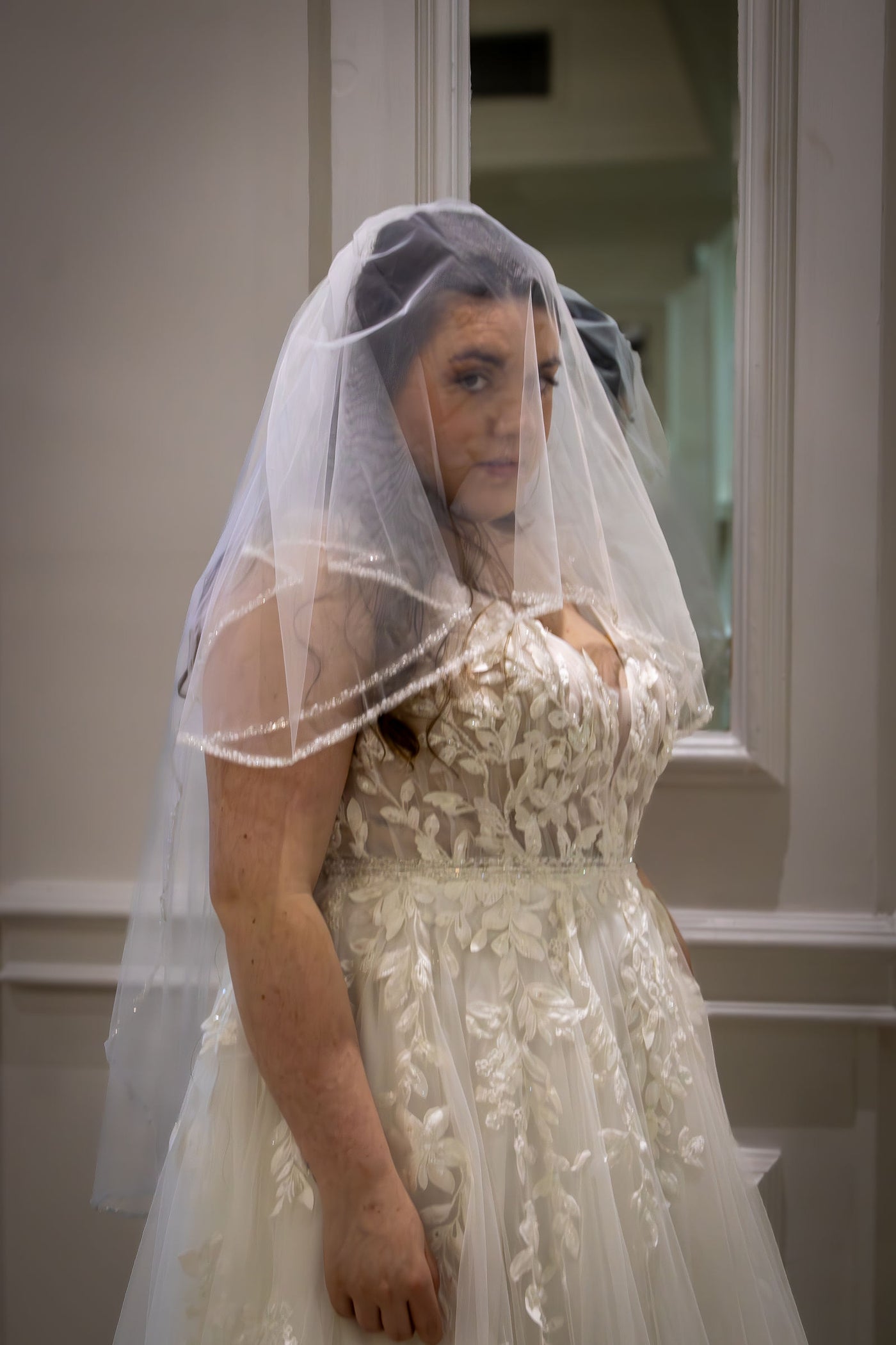 Our Lynette designer wedding dress is an effortlessly boho gown with botanical-inspired crystal beaded embroidery and three-dimensional petals. The delicate tulle floats off the body with a sculptural v-neckline and a crystal beaded waistband to cinch you in and enhance the A-line silhouette. Shown in Ivory/Latte/Honey.