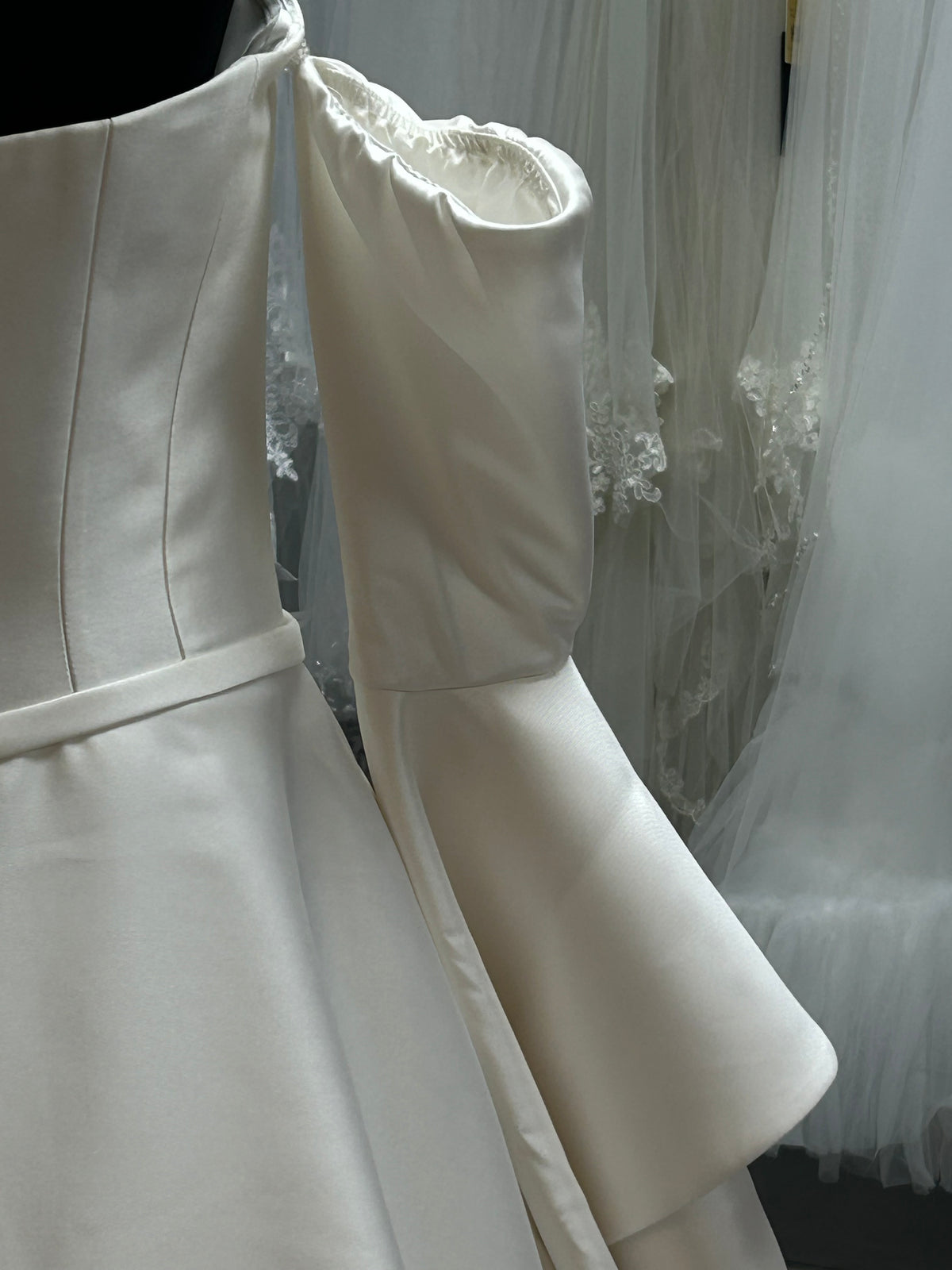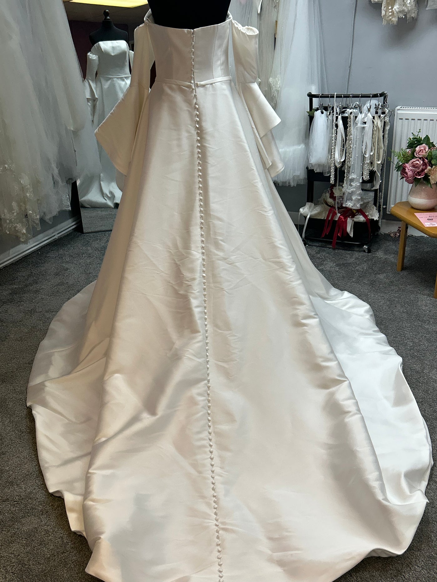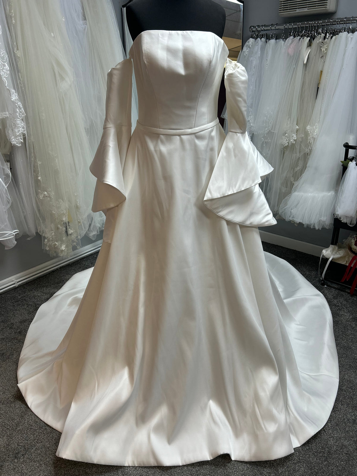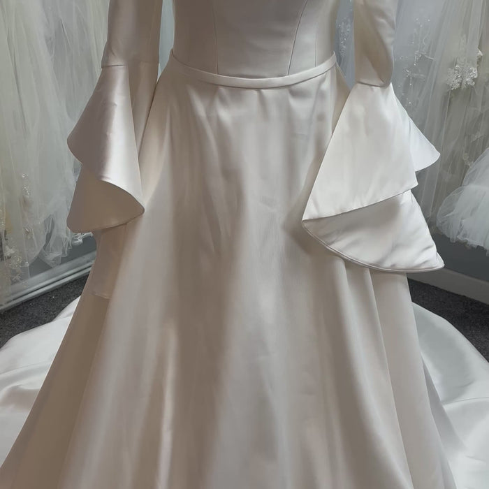 This breath-taking dress features a strapless fitted bodice with a stunning full train and detachable drop trumpet sleeves.