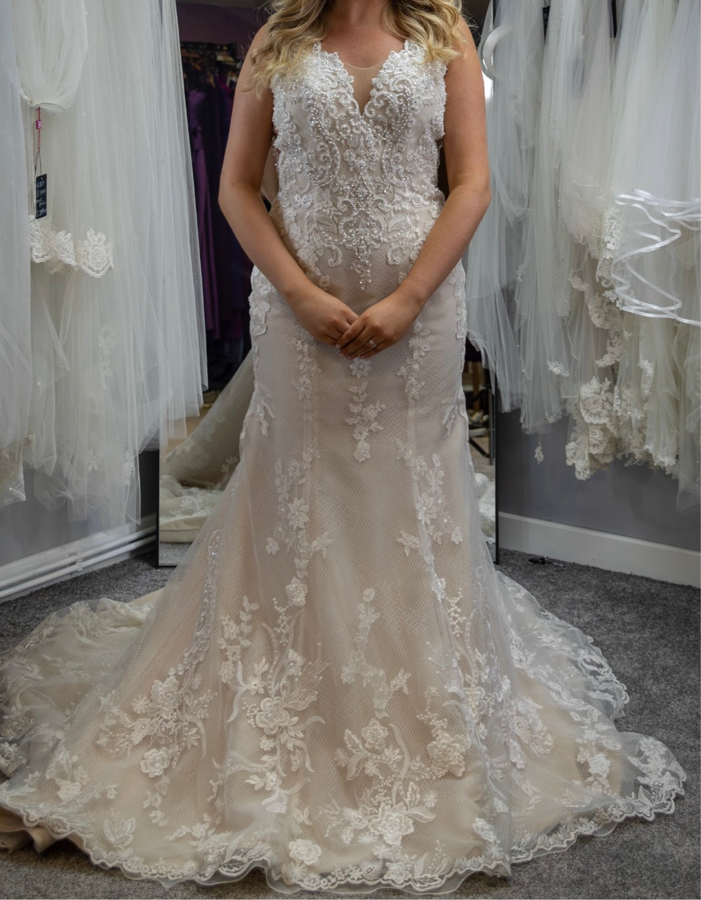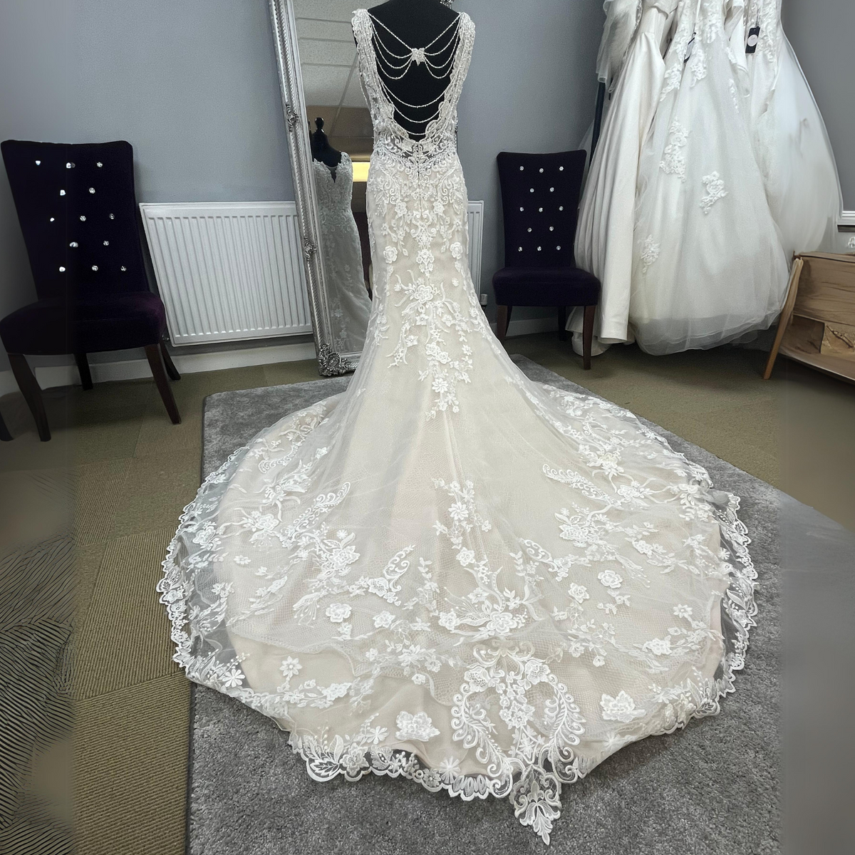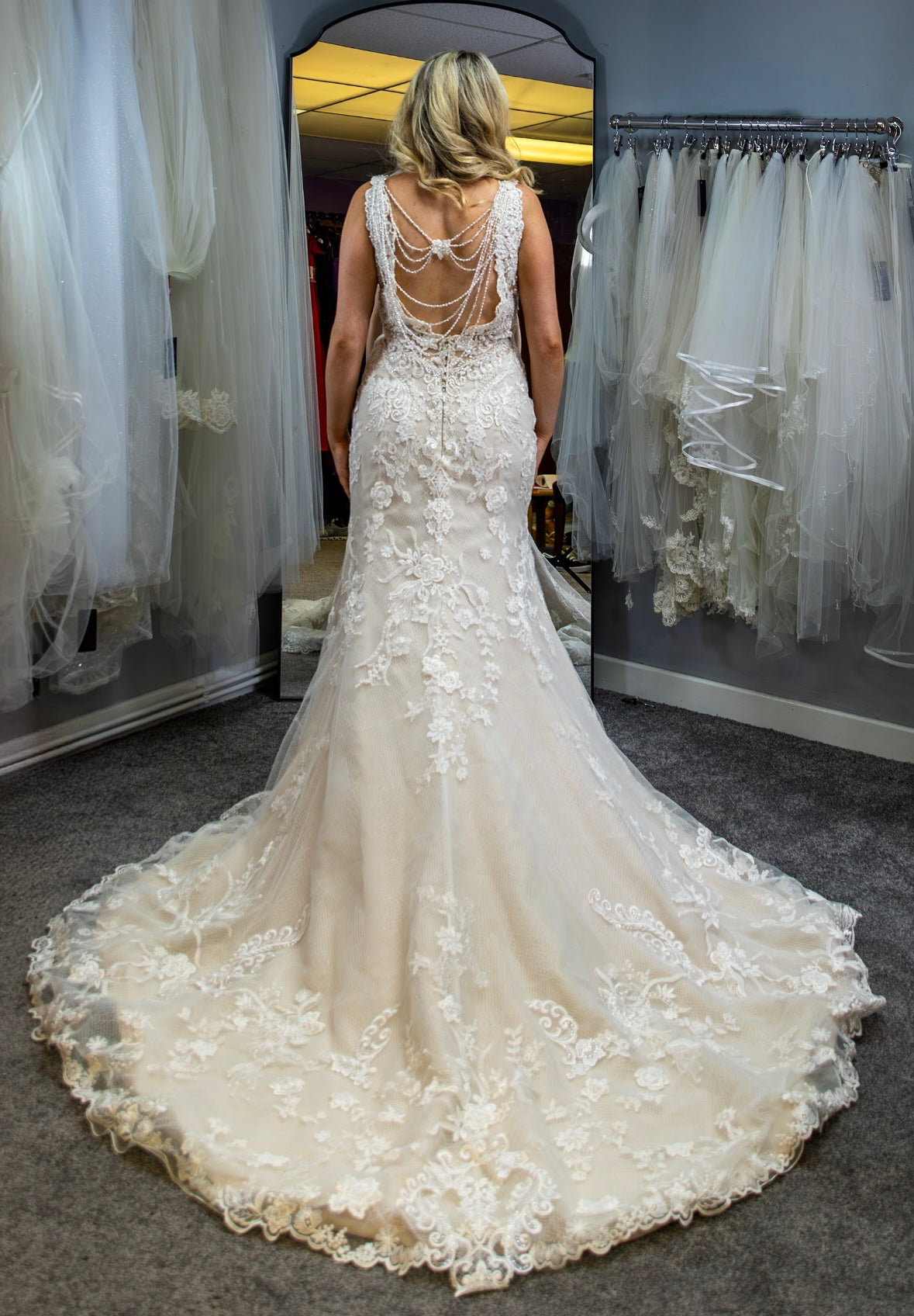 This tulle and lace fit and flare gown is a breathtakingly beautiful choice, with its delicate illusion side panels adding a touch of seduction and mystery. The intricate lace appliques add a romantic and whimsical touch, while the detachable back necklace provides an extra layer of drama and glamour. The overall effect is one of ethereal loveliness, perfect for a bride who wants to feel like a princess on her big day.