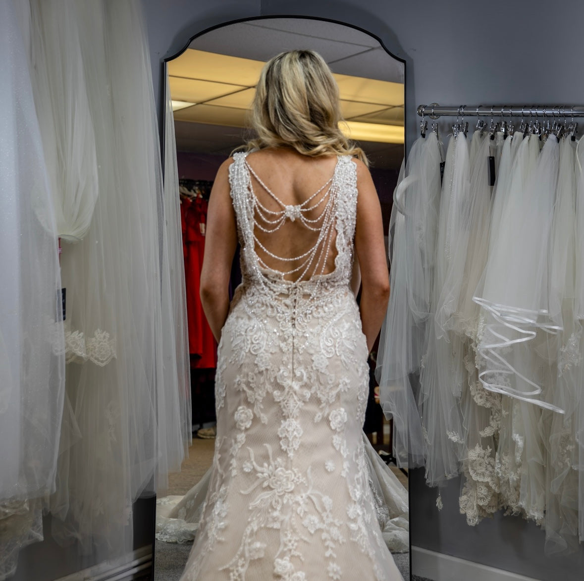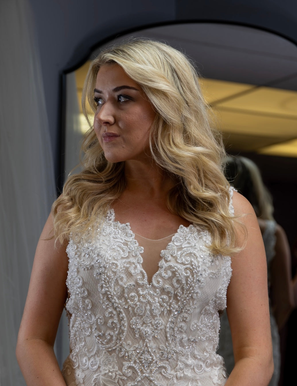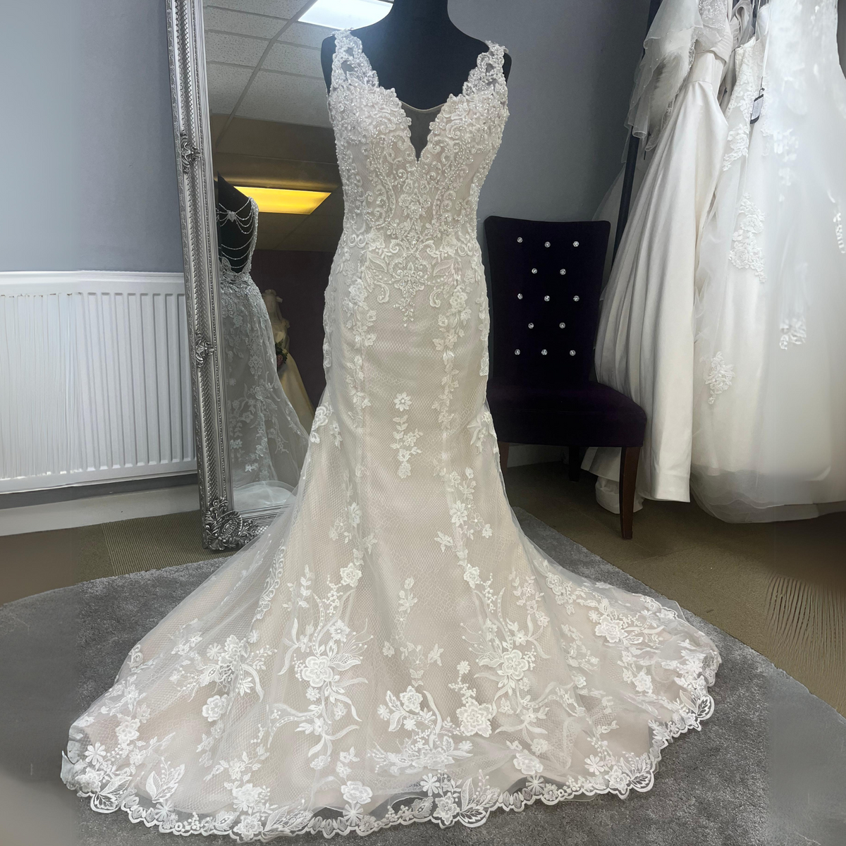 This tulle and lace fit and flare gown is a breathtakingly beautiful choice, with its delicate illusion side panels adding a touch of seduction and mystery. The intricate lace appliques add a romantic and whimsical touch, while the detachable back necklace provides an extra layer of drama and glamour. The overall effect is one of ethereal loveliness, perfect for a bride who wants to feel like a princess on her big day.