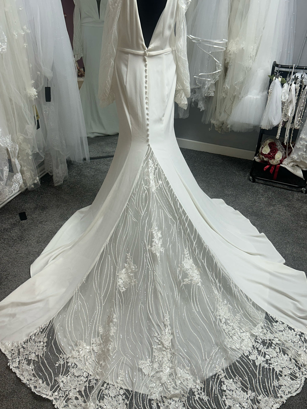 This absolutely breathtaking gown is for the contemporary bride who wants to make a bold, sophisticated statement on her wedding day. The show-stopping plunging V-neckline is daring yet elegant, creating the most stunning silhouette that's both confident and incredibly chic – it's sexy without being over-the-top.