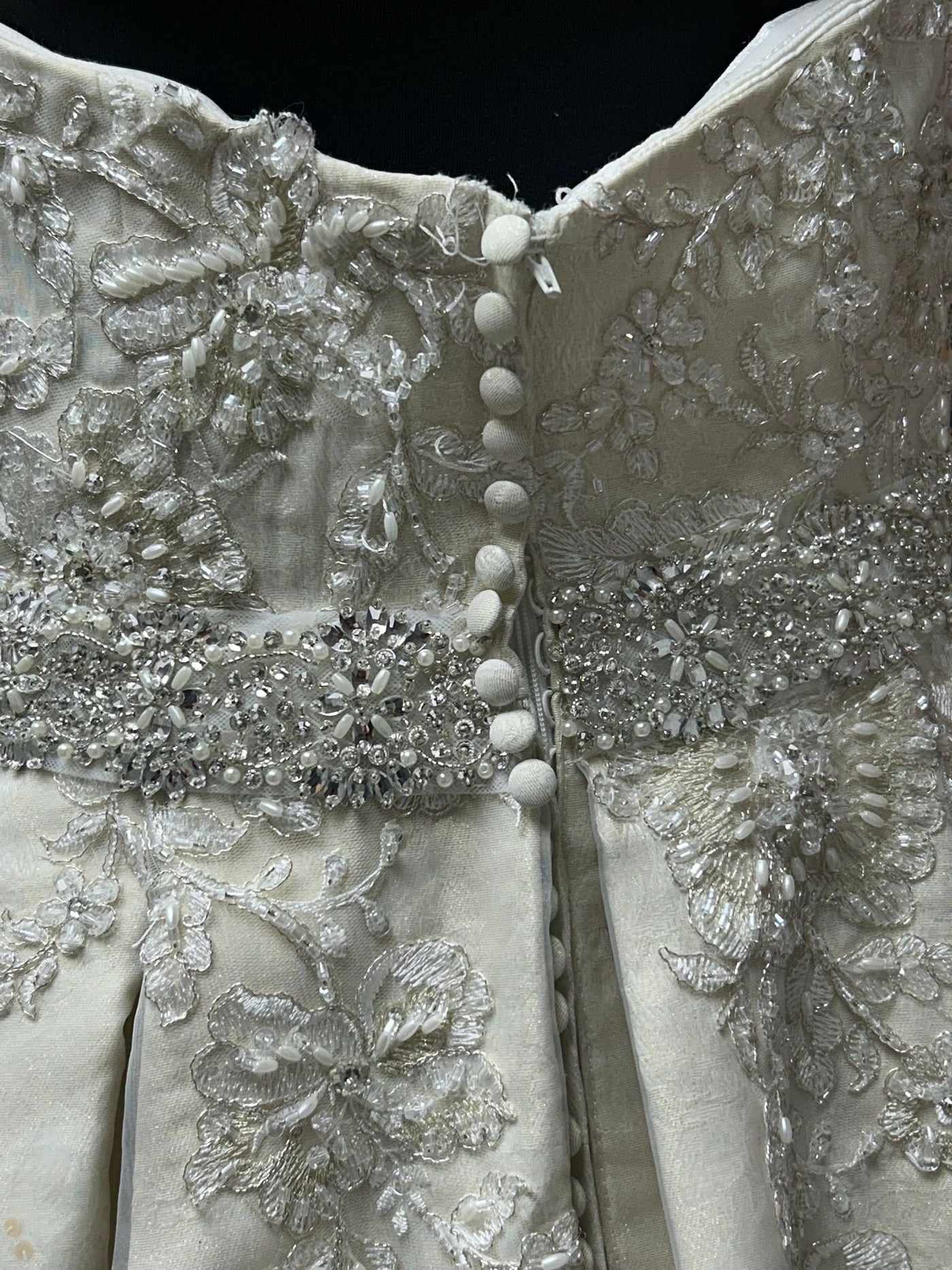 The dramatic full skirt flows gracefully to the floor with layers of luxurious fabric that create that classic fairy tale princess look every bride dreams of. The ivory and champagne tones are universally flattering and photograph like an absolute dream, while the quality construction ensures you'll feel comfortable and confident throughout your entire special day.