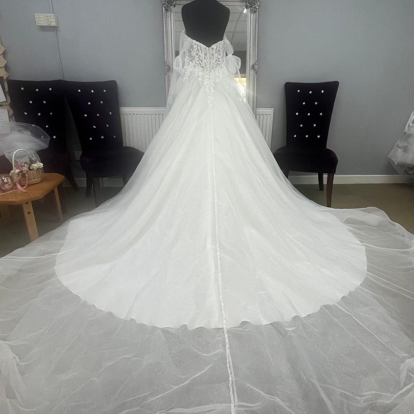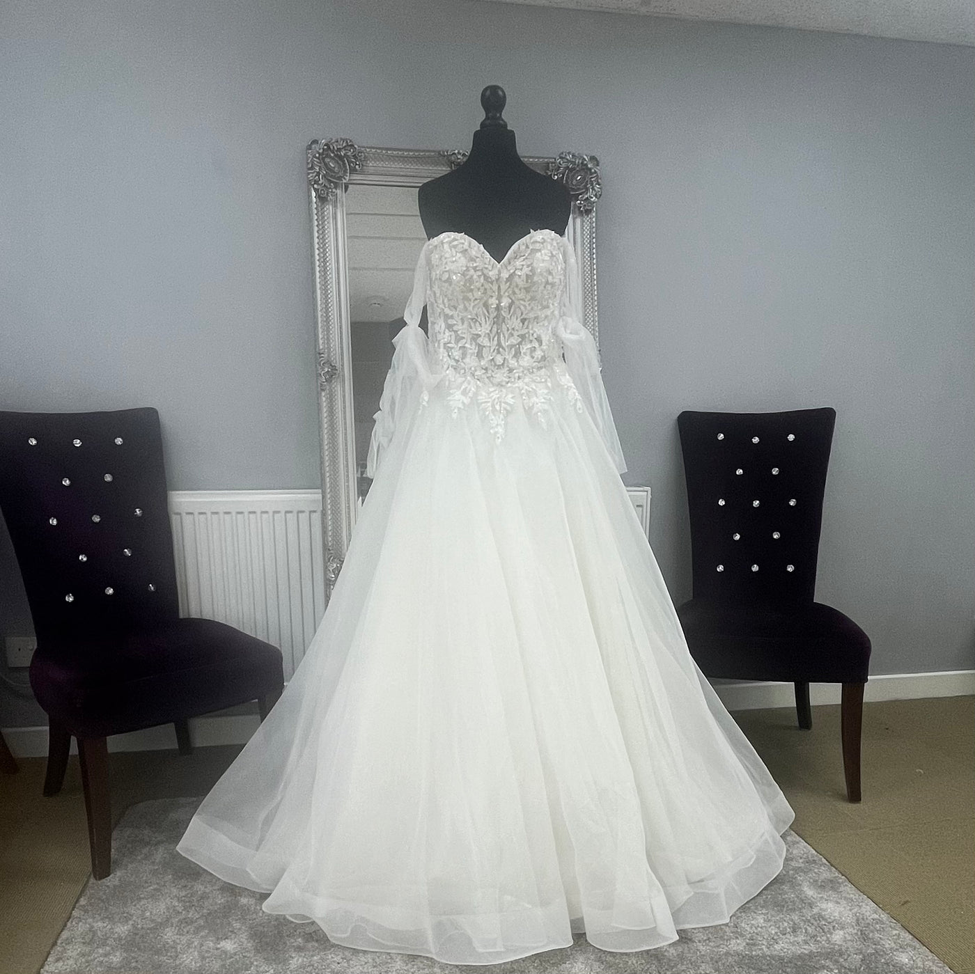 This beautiful ball gown features a Chantilly lace bodice, with a sweetheart neckline, adorned in crystal beaded, three-dimensional floral embroidery. The fantasy continues with a full organza ball gown skirt and sparkling crystal buttons lining down to the horsehair edged hem. Detachable tie bow sleeves add a touch of whimsy to the dress. Shown in Ivory/Honey.