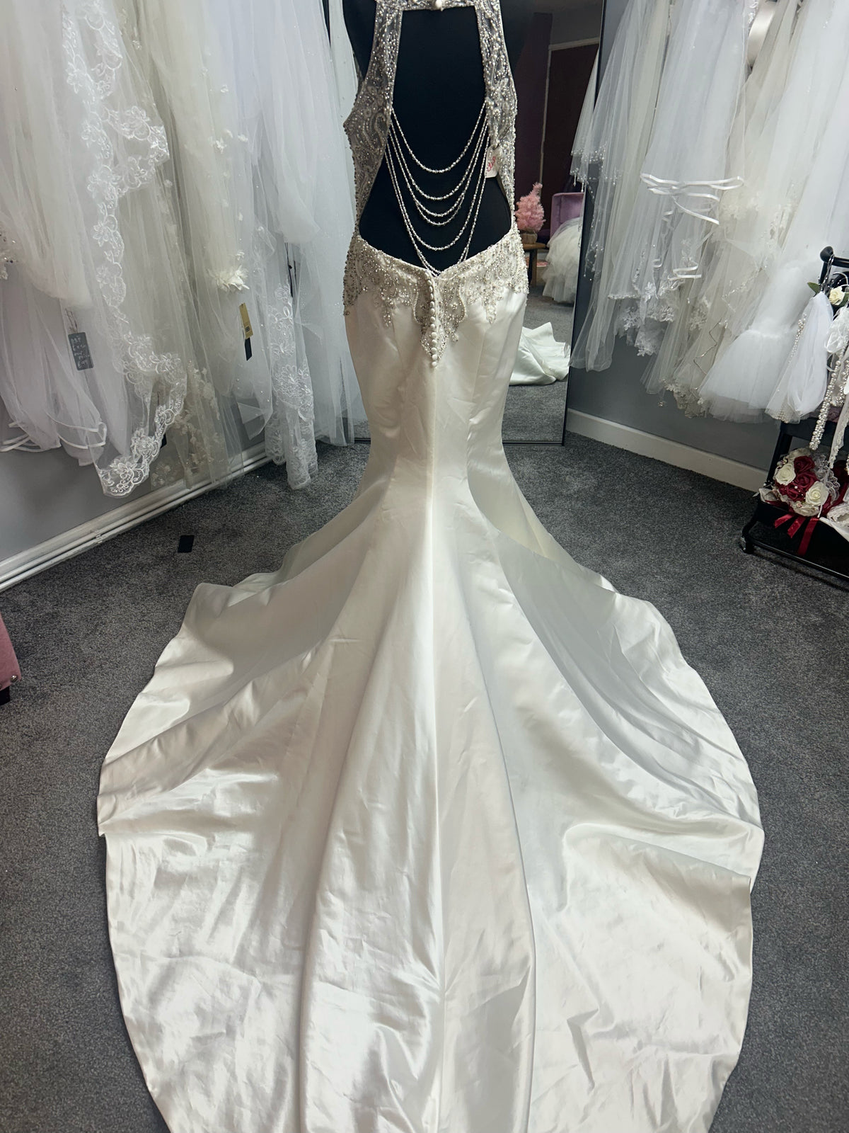 From the natural waistline, the gown transitions into sleek, luxurious satin that hugs your body in a figure-flattering fit-and-flare silhouette. The contrast between the heavily embellished bodice and the smooth, elegant satin skirt creates a beautifully balanced look that's both glamorous and sophisticated. The satin has the most gorgeous sheen, creating that classic bridal elegance as it flows into a dramatic mermaid-style train.
