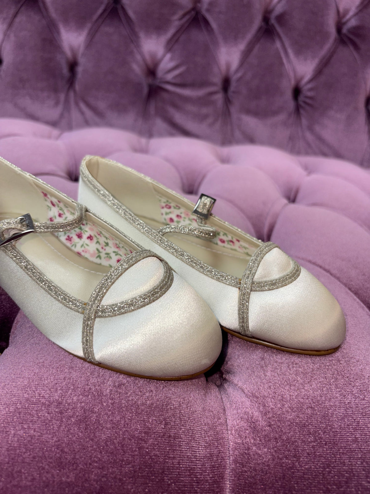 Crafted from beautiful ivory satin, Orlana is a super pretty bridesmaid shoe. These cute bar shoes feature dainty Art Deco-inspired silver fine shimmer ankle straps and overlay detail and are finished with a pretty floral lining. Coordinating with our Chelsey bridal shoe as well as our wedding shoes within the silver fine shimmer collection, they’re perfect for brides looking for cute ‘mini’ versions of their own.