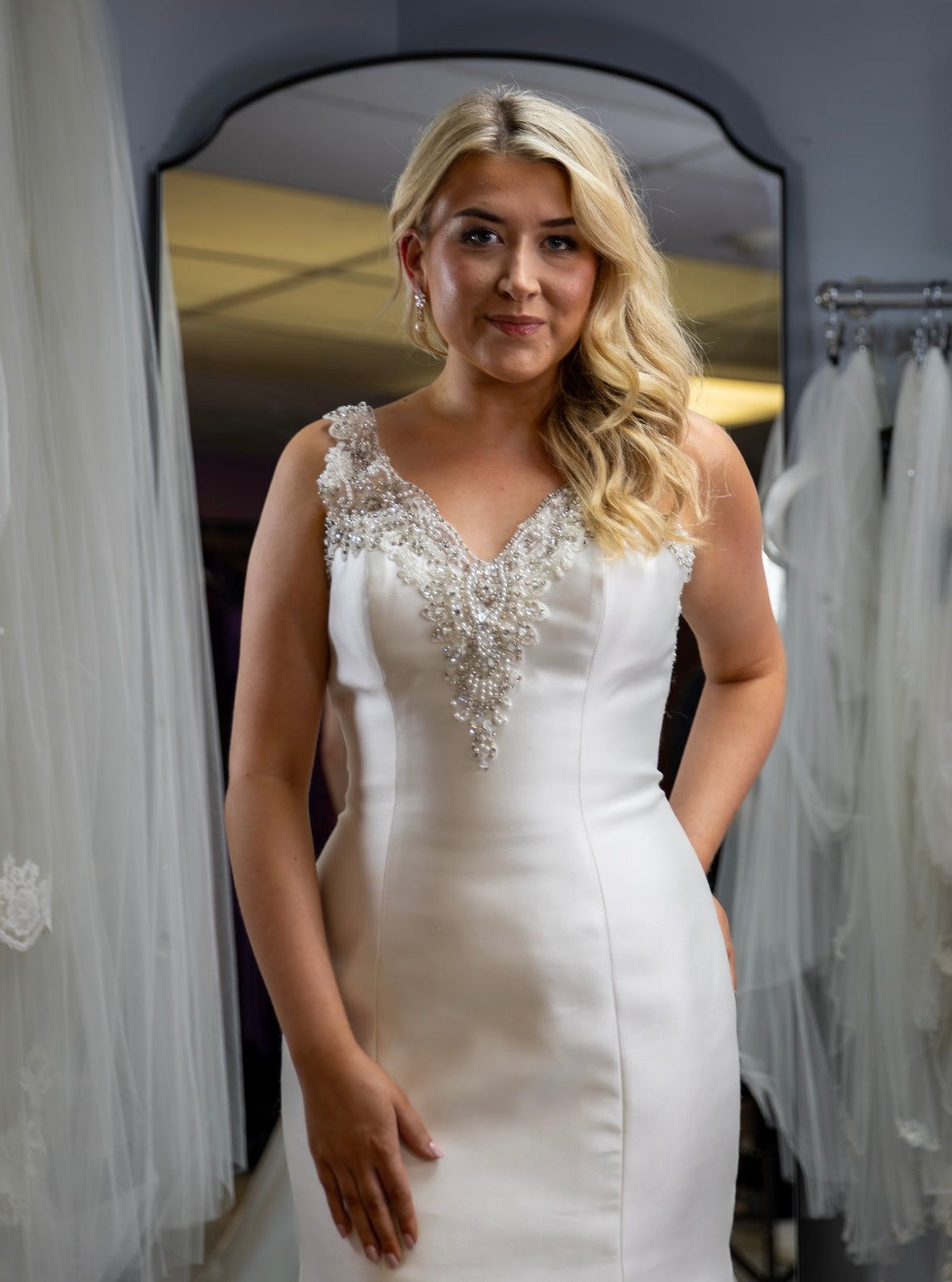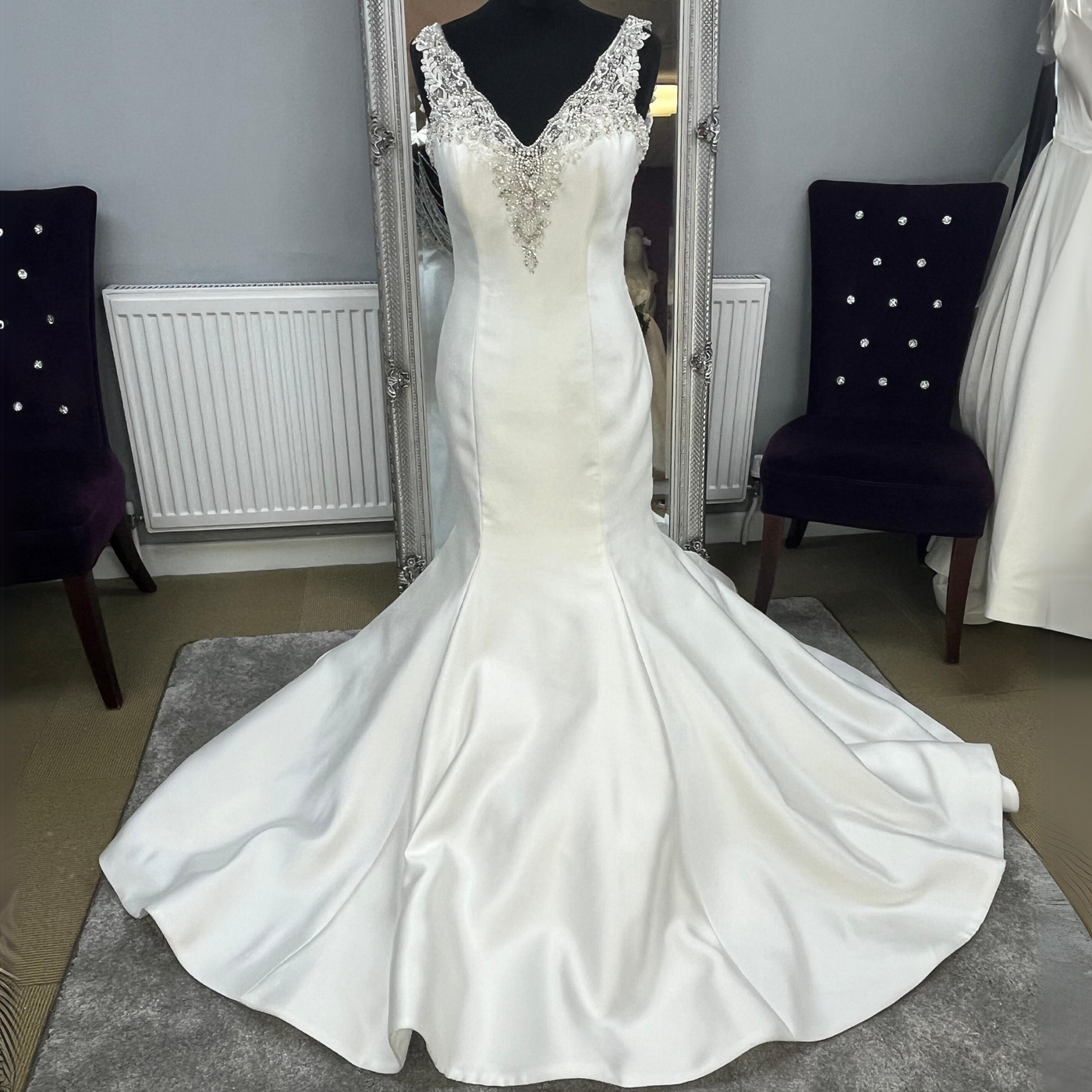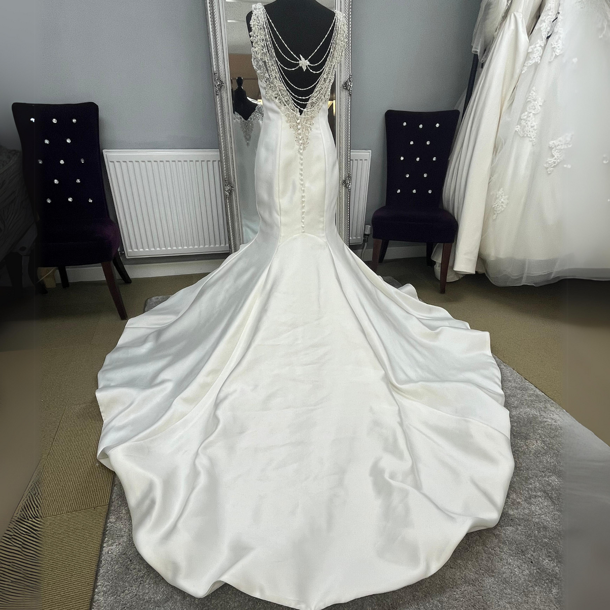 This stunning fishtail gown is a showstopper, with its beaded V neckline adding a touch of sophistication and glamour. The detachable back necklace adds an extra layer of drama and whimsy, perfect for making a memorable entrance or striking a pose on the dance floor. The flowing fishtail train creates a breathtaking silhouette, making this gown perfect for a fairytale-inspired wedding.