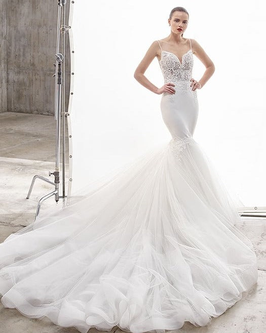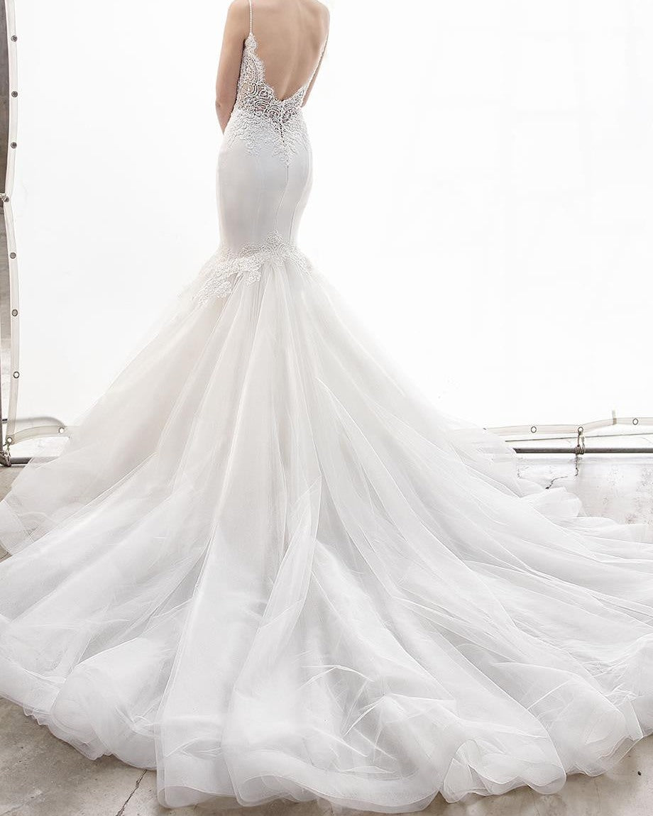 A stunning mermaid full-length gown featuring floral corded lace on a sexy, beaded illusion bodice with a plunging neckline and extremely low back. Finished with a voluminous tulle skirt for added flare.
