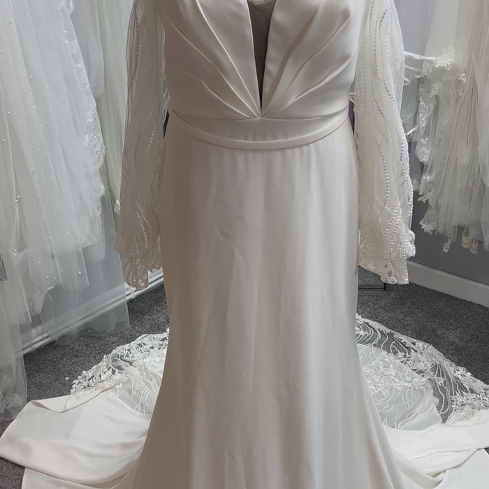 The 122180 wedding dress by Enchanting Mon Cheri is a modern and effortlessly chic choice for brides who love unique details. Crafted in sleek ivory crepe, this gown features a daring plunging neckline and softly pleated bodice for a striking, contemporary look. The fitted silhouette is elevated by dramatic detachable beaded sleeves, adding a touch of bohemian flair, while the skirt flows into a gentle train for a graceful finish. Perfect for brides seeking confidence and individuality, 122180 is ideal for making a bold and unforgettable entrance on your special day.